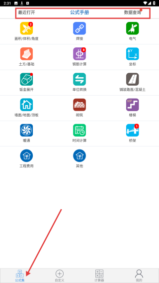 1、打開(kāi)公式集應(yīng)用,在公式手冊(cè)頁(yè)面,可查看各類(lèi)專(zhuān)業(yè)公式分類(lèi)。