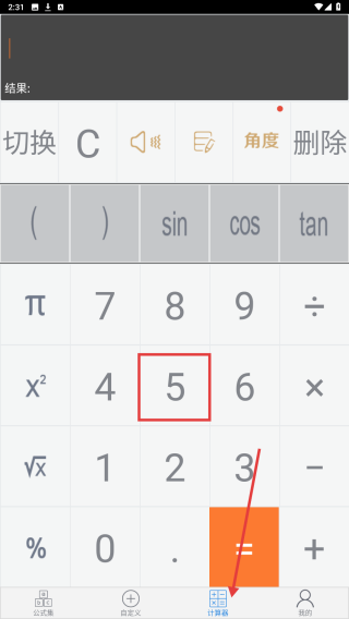 3、點(diǎn)擊計(jì)算器選項(xiàng),進(jìn)入計(jì)算界面,輸入數(shù)字如5等進(jìn)行計(jì)算操作。
