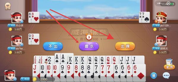 2、進(jìn)入對(duì)局后,手牌區(qū)會(huì)展示當(dāng)前持有的所有牌型,當(dāng)不確定如何出牌時(shí),點(diǎn)擊界面中間的提示按鈕,系統(tǒng)會(huì)基于當(dāng)前局勢(shì)給出合理的出牌建議。