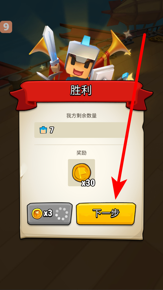 4、最后獲取勝利獎勵,成功戰(zhàn)勝敵方后,會出現(xiàn)勝利界面,展示己方剩余數(shù)量以及獲得的獎勵,點擊下一步,可繼續(xù)后續(xù)的游戲進(jìn)程。