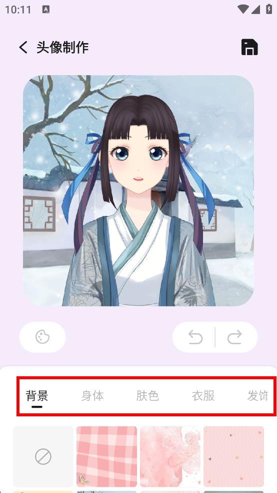 3、在頭像制作界面,可選擇背景,身體,膚色等分類(lèi),對(duì)頭像進(jìn)行定制。