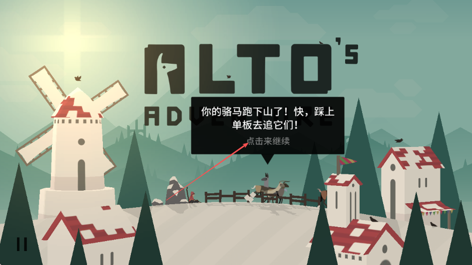 1、游戲開始界面看到提示你的駱馬跑下山了!快,踩上單板去追它們!點擊來繼續(xù)進入游戲。