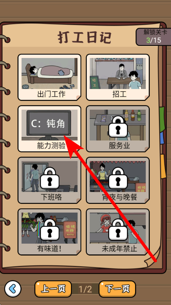1、玩家游玩先要選擇關(guān)卡,在打工日記的關(guān)卡選擇界面,挑選想要挑戰(zhàn)的關(guān)卡,比如能力測(cè)驗(yàn)等已解鎖關(guān)卡,進(jìn)入對(duì)應(yīng)的打工場(chǎng)景。