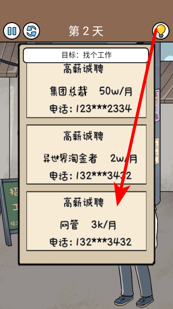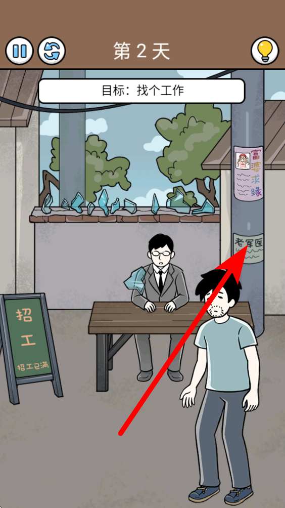 2、然后尋找工作線索,進(jìn)入打工場(chǎng)景后,仔細(xì)觀察場(chǎng)景內(nèi)的元素,像電線桿上的招聘信息等,從中獲取找工作的解謎,為找到工作做準(zhǔn)備。