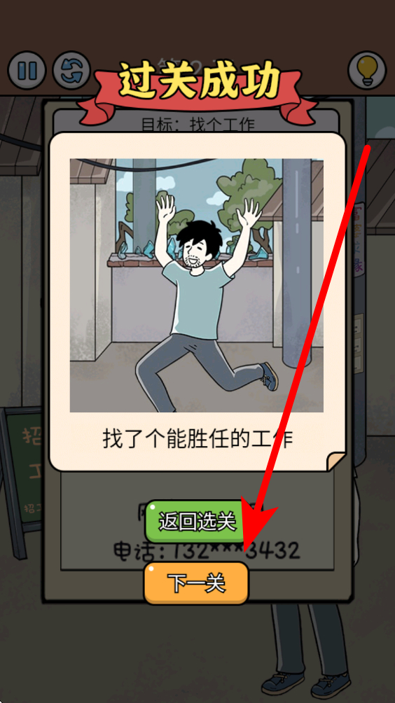 4、最后推進(jìn)關(guān)卡,成功找到并確定工作后,即可完成當(dāng)前關(guān)卡,點(diǎn)擊下一關(guān),繼續(xù)挑戰(zhàn)后續(xù)的打工關(guān)卡,體驗(yàn)更多打工相關(guān)的趣味內(nèi)容。