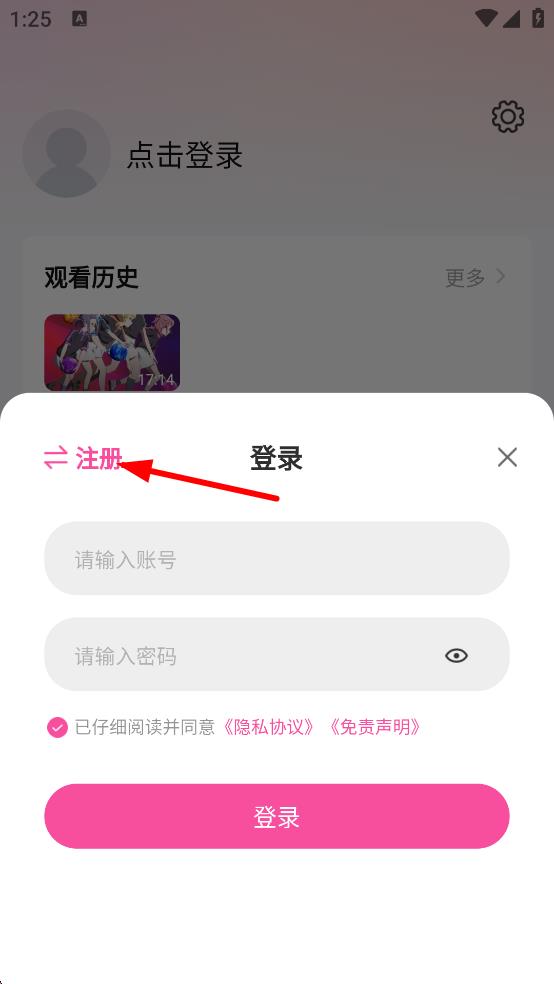 2、在個人頁面,隨后點擊登錄,彈出登錄注冊窗口。