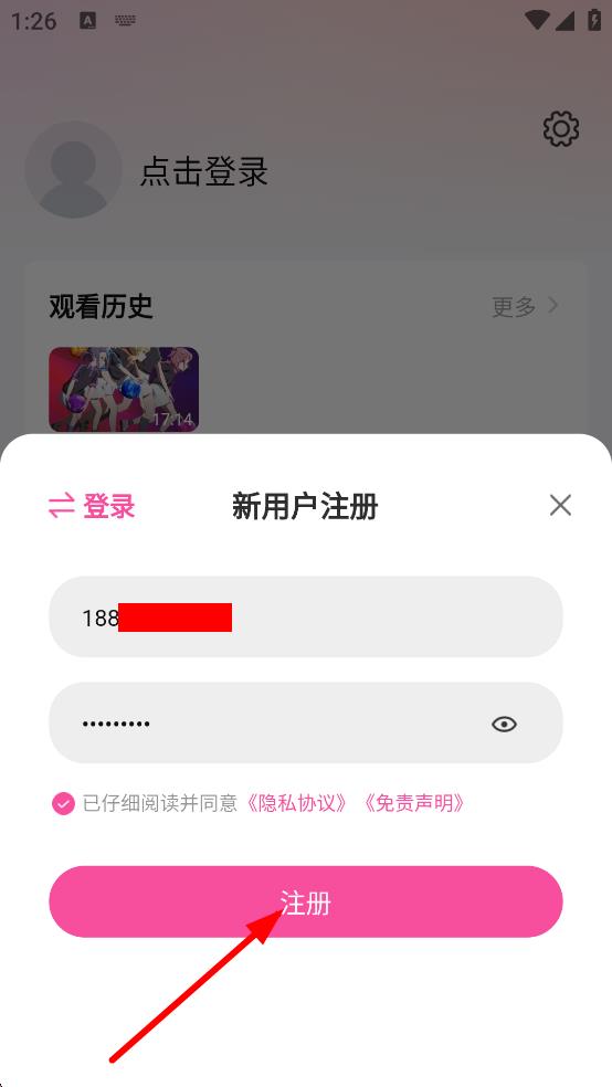 4、填寫賬號、密碼等信息,勾選同意協(xié)議后,點擊注冊隨后完成注冊。