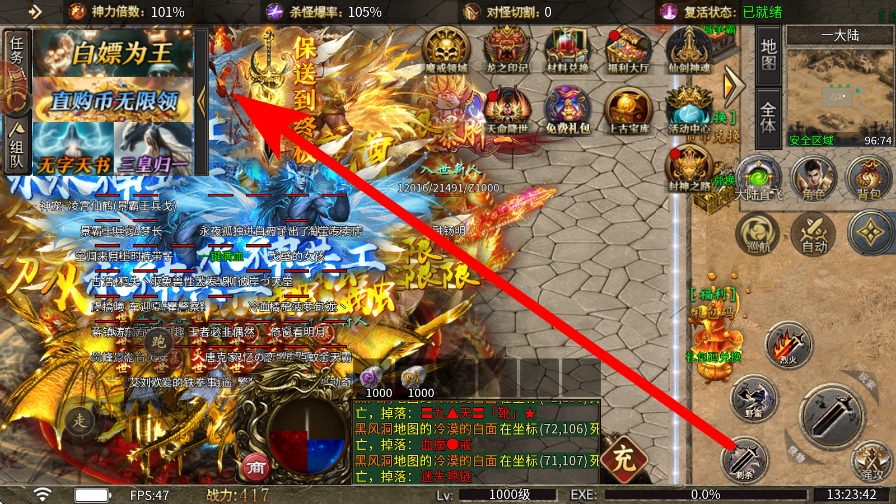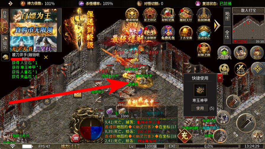 1、超高爆率設(shè)定:世界內(nèi)所有怪物都會高概率掉落極品裝備,稀有道具也可以通過刷怪直接獲取,大幅降低玩家的裝備獲取難度,讓戰(zhàn)斗更加暢快。