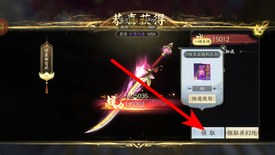 3、接著領(lǐng)取獎勵,當獲得裝備等獎勵時,可點擊領(lǐng)取或領(lǐng)取并幻化,獲取心儀的物品,這些物品能助力角色在江湖中更好地闖蕩。