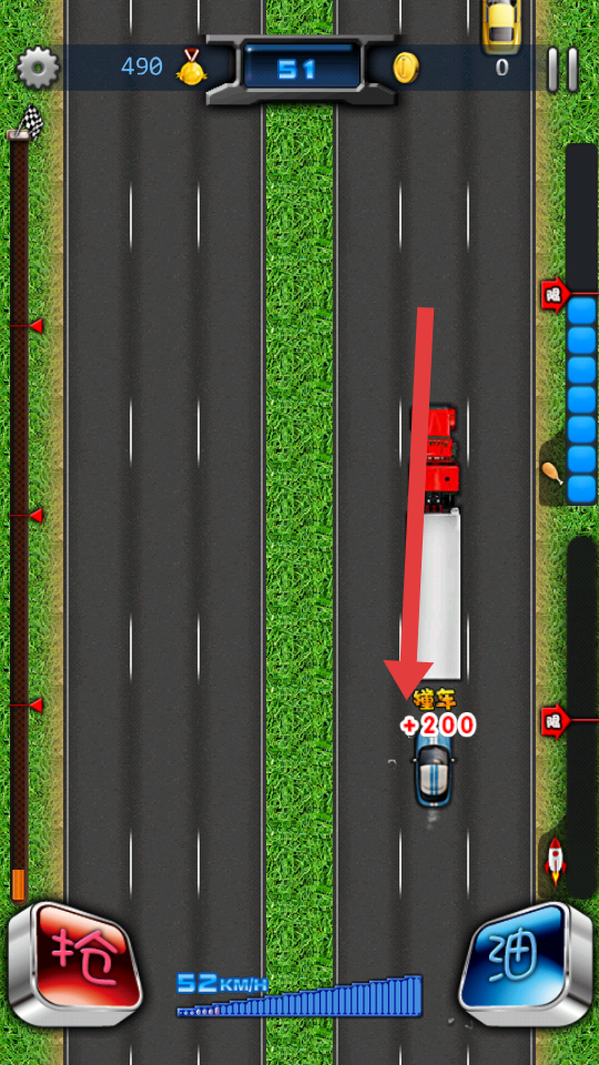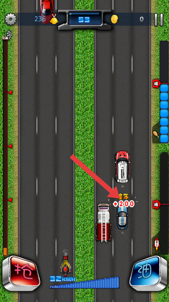 2、轎車阻擋路線時,瞄準(zhǔn)目標(biāo)車輛點擊已裝備的武器如虛擬炮彈,擊中后可清除障礙并觸發(fā)撞車+200的得分提示。