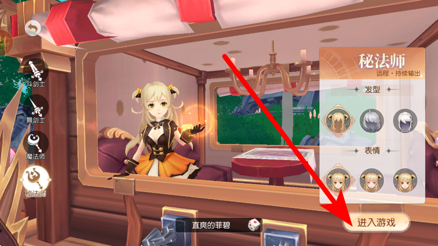 1、首先創(chuàng)建角色職業(yè),角色創(chuàng)建界面,可選擇秘法師等職業(yè),還能定制發(fā)型、表情等,打造獨特角色形象,之后點擊進入開啟冒險。