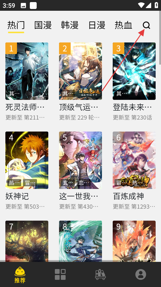 1、在漫畫(huà)類(lèi)應(yīng)用首頁(yè),點(diǎn)擊右上角搜索圖標(biāo),進(jìn)入搜索頁(yè)面。