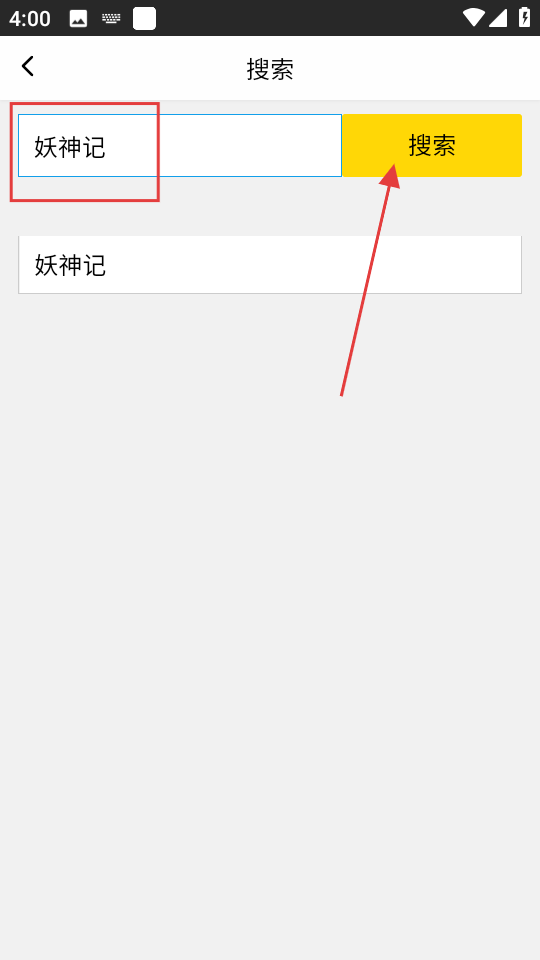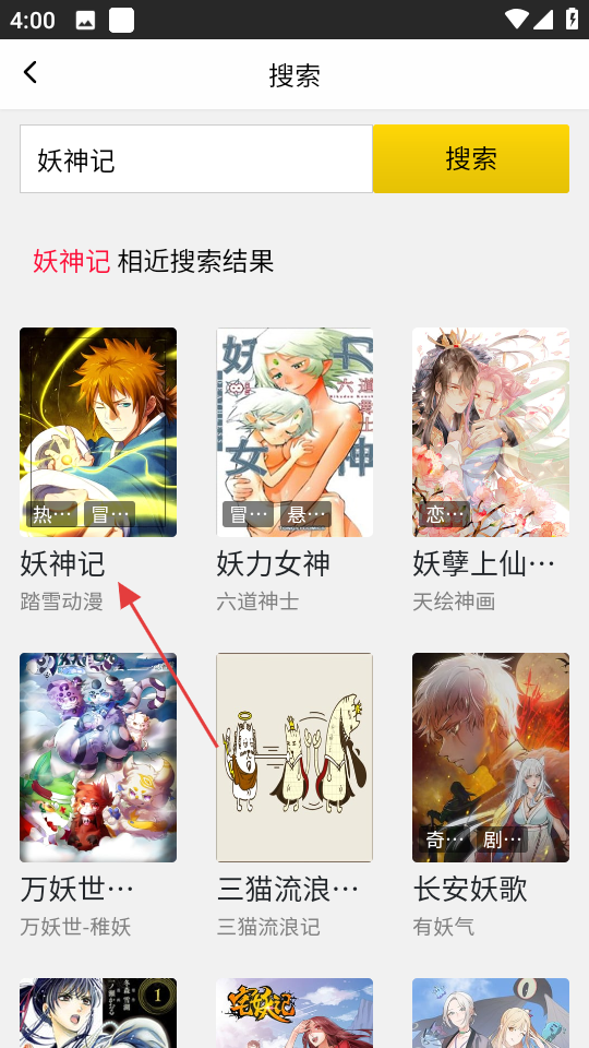 2、在搜索頁(yè)面,輸入想看的漫畫(huà)如妖神記,點(diǎn)擊搜索,獲取搜索結(jié)果。