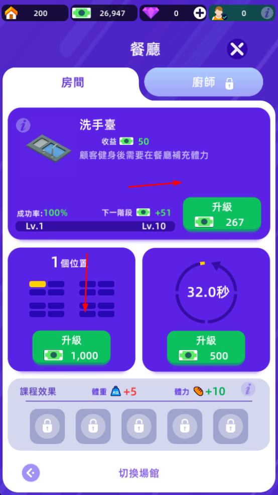 4、切換到餐廳等場(chǎng)館,可升級(jí)洗手臺(tái)等設(shè)施,滿足顧客健身后補(bǔ)充體力的需求,同時(shí)提升收益。