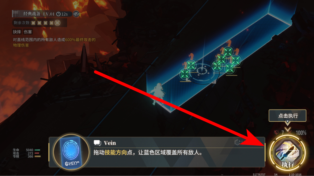 2、然后釋放技能,戰(zhàn)斗根據(jù)提示拖動技能方向點,讓技能的藍色覆蓋區(qū)域籠罩所有敵人,再點擊執(zhí)行,釋放技能對敵人造成傷害。