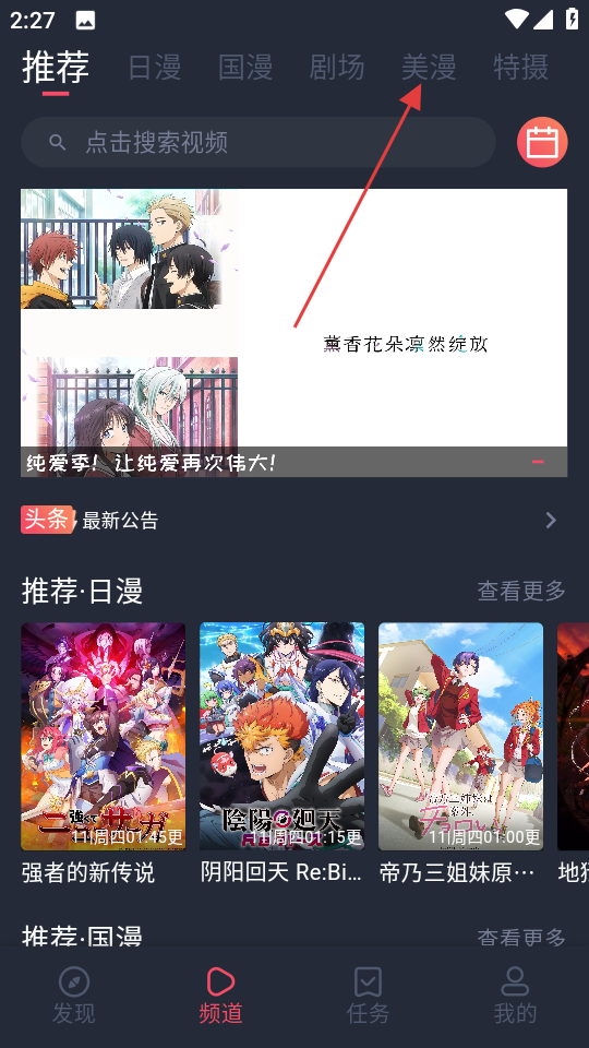 1、打動(dòng)漫共和國(guó),在頂部導(dǎo)航欄點(diǎn)擊美漫。