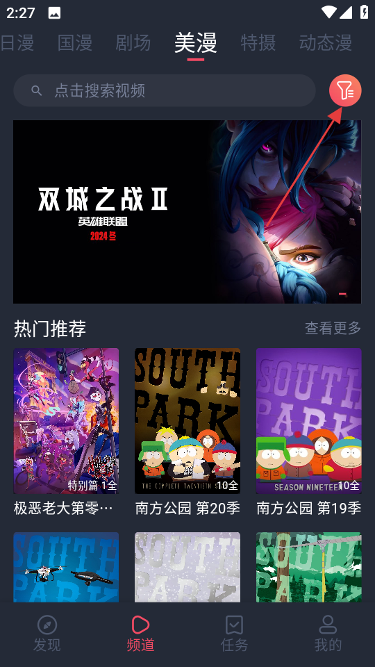 2、進(jìn)入美漫頁(yè)面后,點(diǎn)擊右上角的篩選圖標(biāo)。