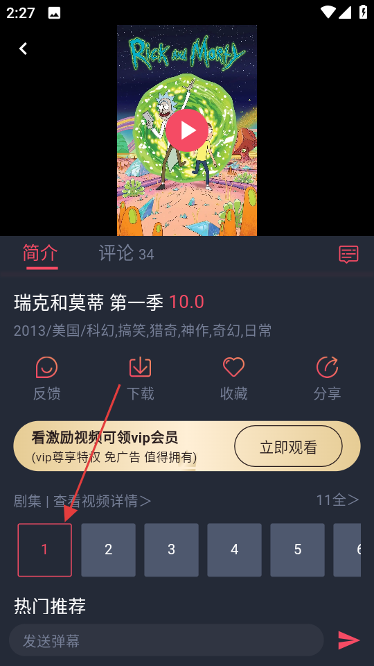 4、進(jìn)入瑞克和莫蒂第一季詳情頁(yè)后,點(diǎn)擊1即可觀看第一集。