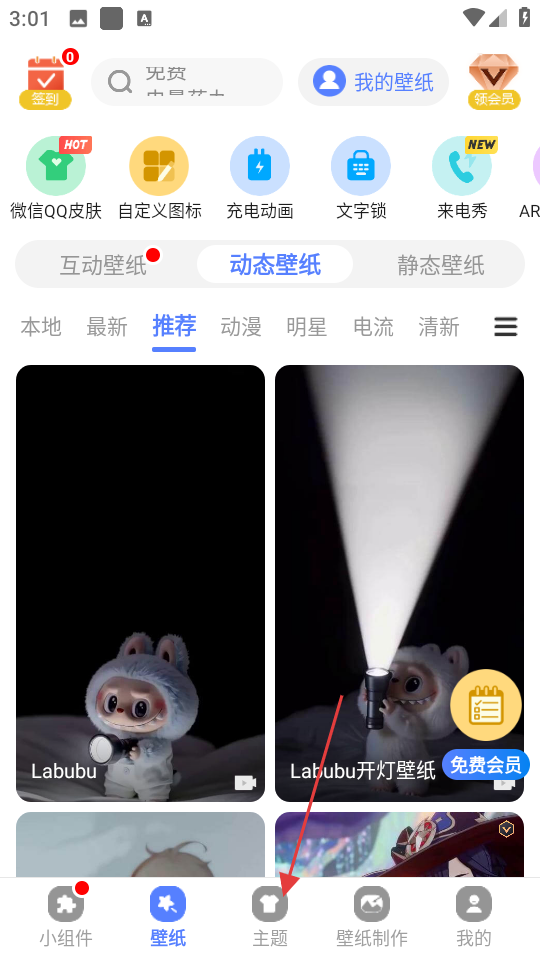 1、打開心動(dòng)主題壁紙,點(diǎn)擊底部導(dǎo)航欄的主題。