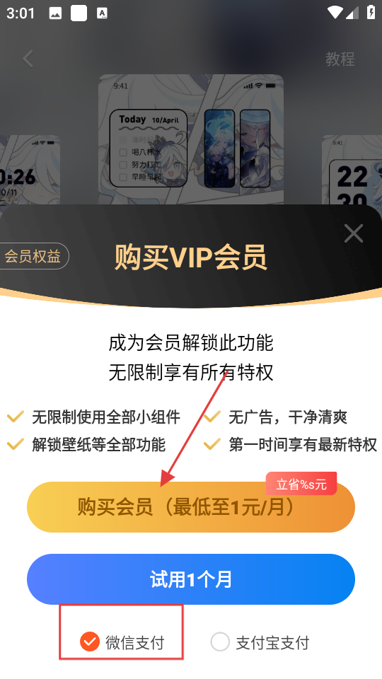 4、在購(gòu)買VIP會(huì)員頁面,選擇購(gòu)買會(huì)員,完成購(gòu)買后即可繼續(xù)設(shè)置主題。