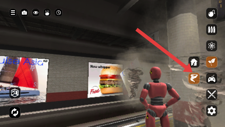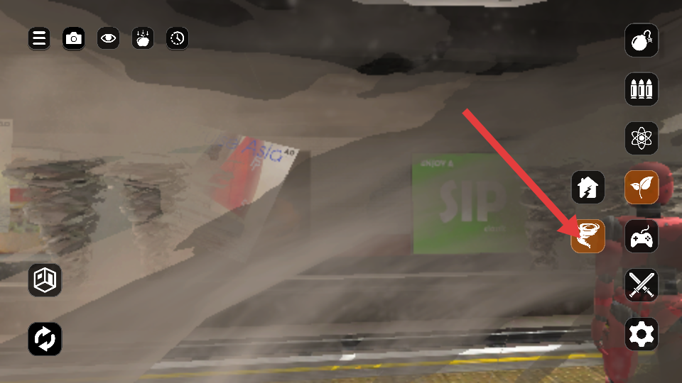 3、道具調(diào)用與使用,在界面道具欄通常顯示炸彈、龍卷風(fēng)等圖標(biāo)中,點(diǎn)擊選擇目標(biāo)道具。使用炸彈時(shí),將其拖動(dòng)至目標(biāo)物體。