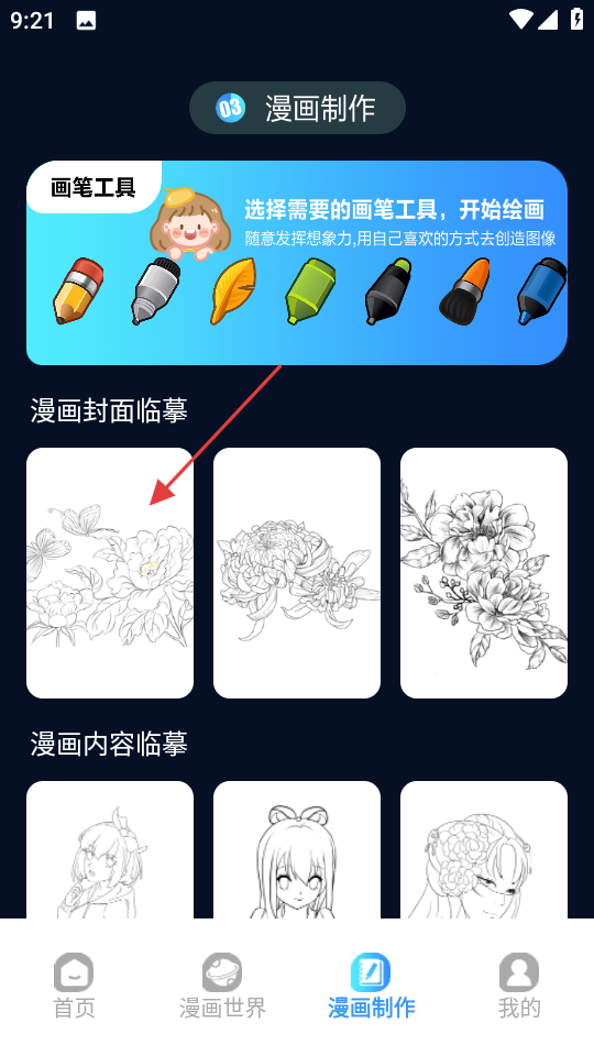 2、進入漫畫制作頁面后,選擇漫畫封面臨摹中的圖案。