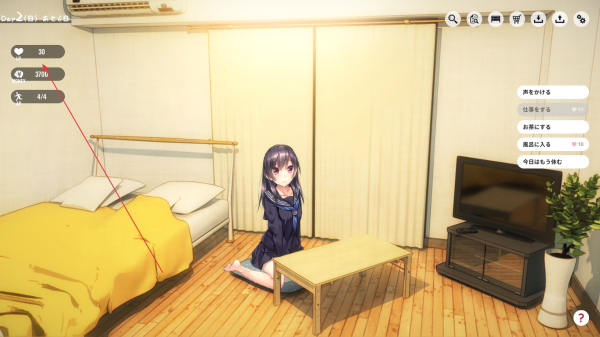 3、留意屏幕左側(cè)顯示的愛心數(shù)值代表好感度,金幣和步數(shù)等信息,通過合理互動和行動提升好感度。