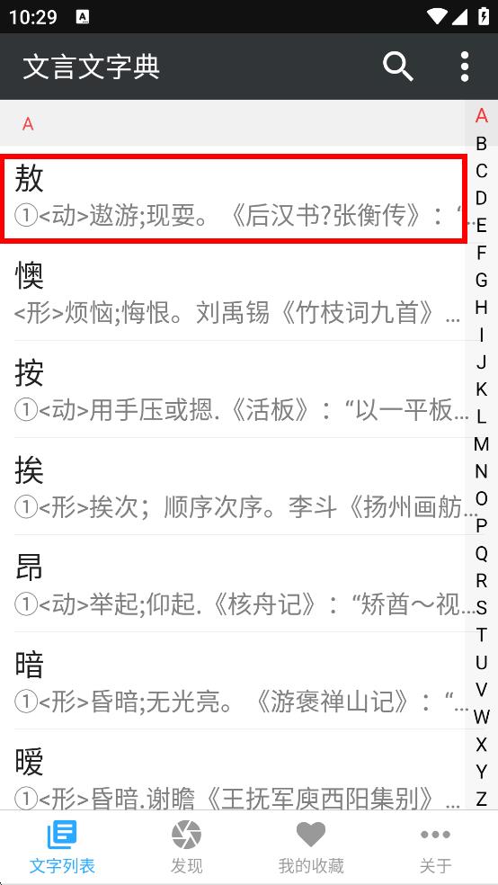 1、在文言文字典的文字列表頁面,點擊要查詢的字,進入該字詳情頁。