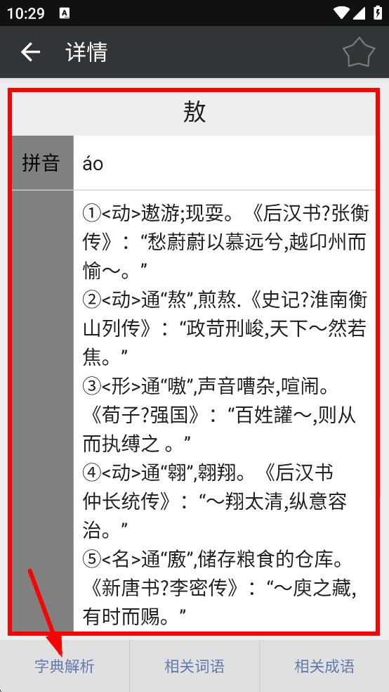 2、詳情頁中可查看字典解析,了解該字的多種釋義。