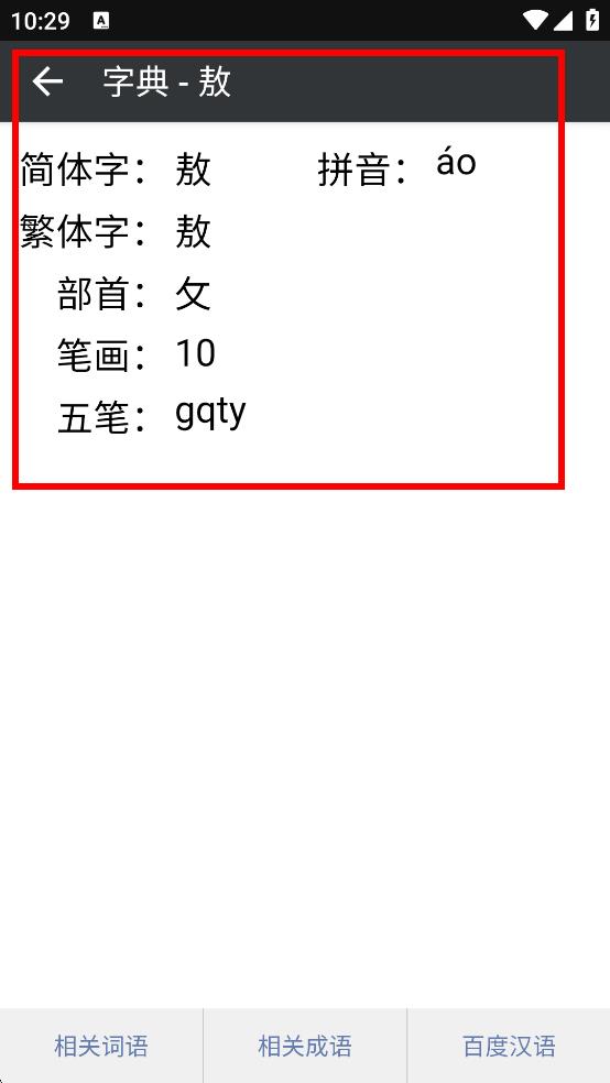 3、還能查看該字的簡體字、繁體字、部首、筆畫、五筆等信息。