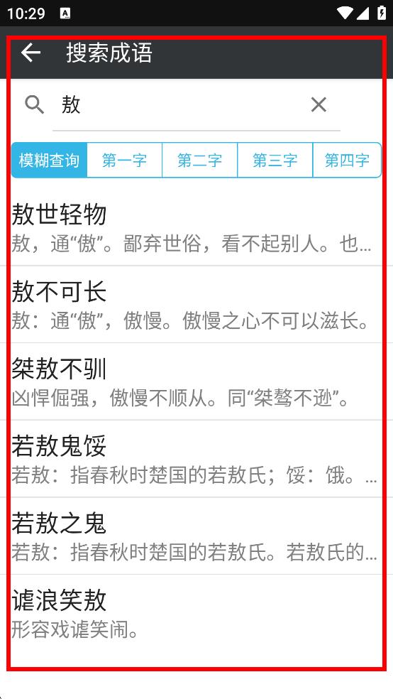 4、在搜索成語頁面,輸入該字,可查詢包含該字的成語。