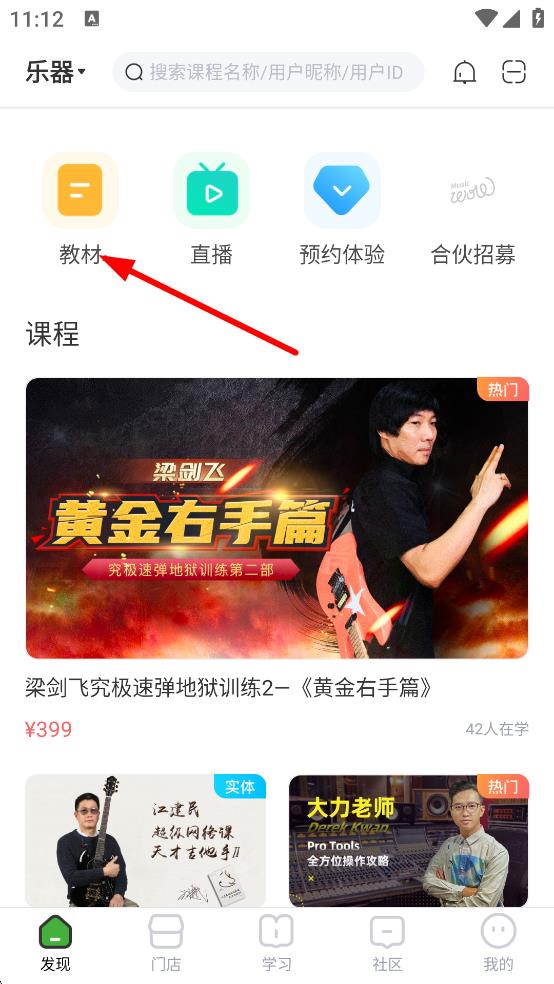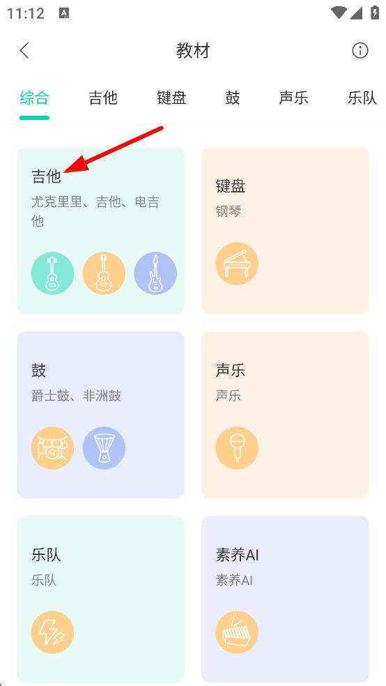 2、在教材頁面,點擊吉他分類,進入吉他教材頁面。