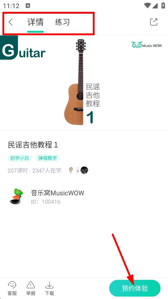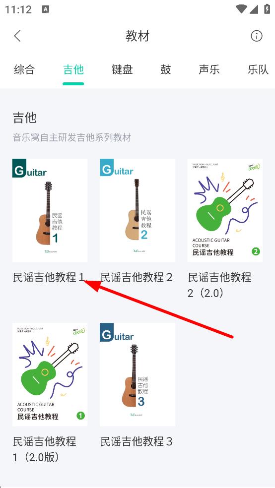 3、在吉他教材頁面,選擇想要查看的教材,點民謠吉他教程1。