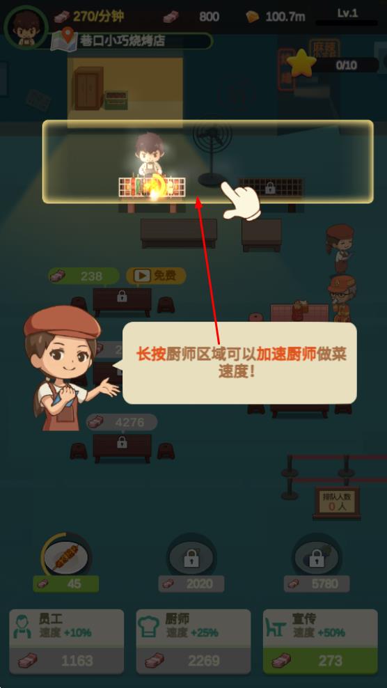1、進(jìn)入巷口小巧燒烤店后,長(zhǎng)按廚師區(qū)域可加速廚師做菜速度,提升出餐效率,這是加快經(jīng)營節(jié)奏的關(guān)鍵操作。