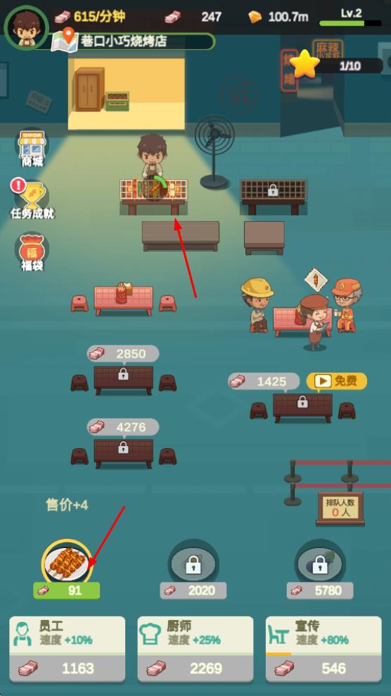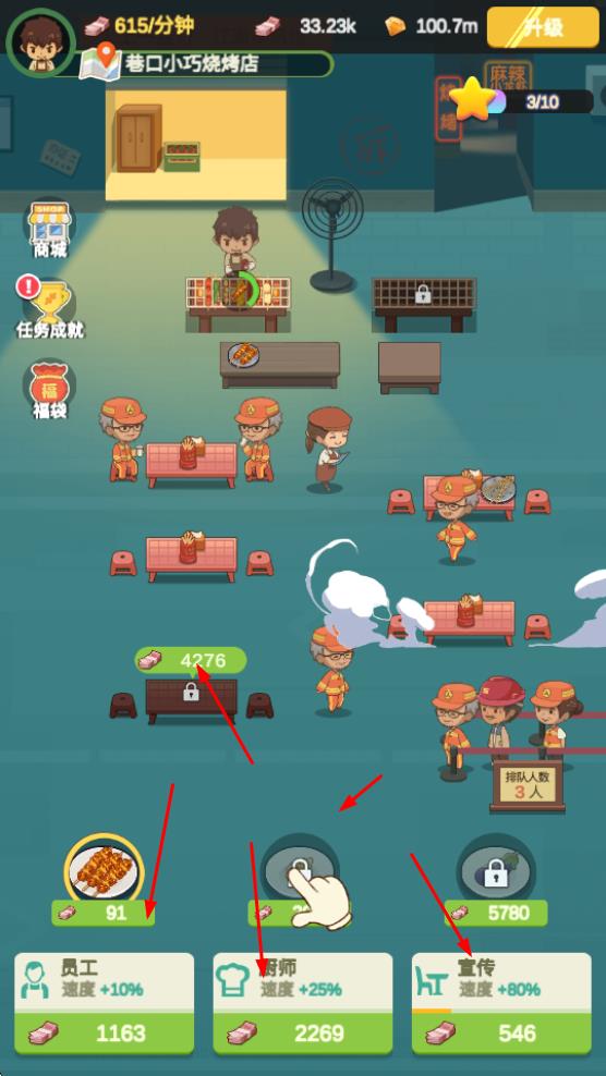 2、可升級(jí)菜品如提升燒烤售價(jià),同時(shí)升級(jí)員工、廚師、宣傳等模塊,分別增加速度或收益,助力店鋪發(fā)展。