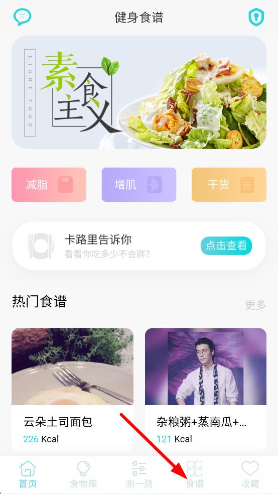1、在健身食譜應(yīng)用首頁,點擊底部食譜,進入食譜分類頁面。
