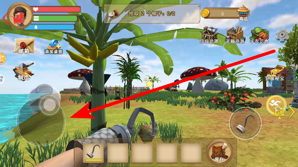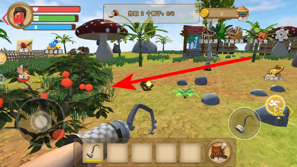 4、最后采集資源,在荒島的各個(gè)區(qū)域,尋找并采集椰子、石頭等資源,這些資源可用于制作物品、交易等,助力在荒島更好地生存。