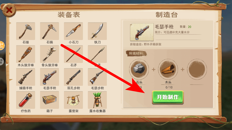 2、然后制作武器,進(jìn)入制造界面,查看各類(lèi)武器的所需材料,當(dāng)材料集齊后,點(diǎn)擊“開(kāi)始制作”按鈕,就能制作出相應(yīng)的武器,提升生存與戰(zhàn)斗能力。