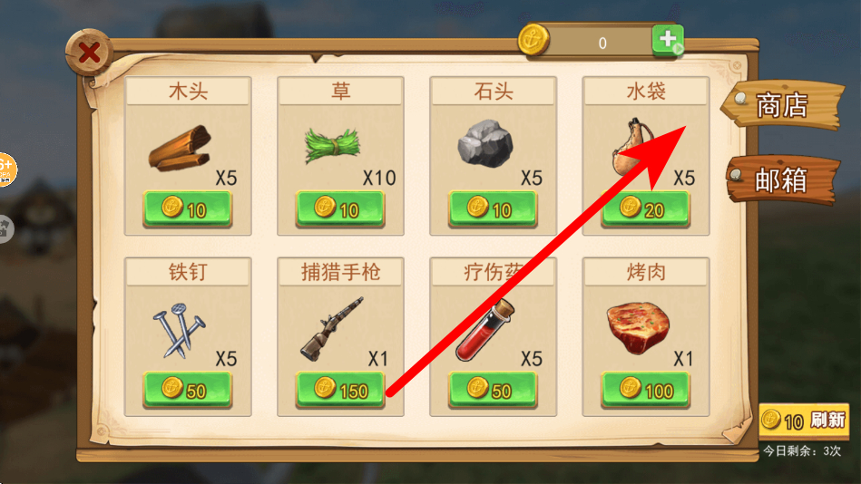 3、接著利用商店,在商店界面,可花費(fèi)金幣購(gòu)買(mǎi)木頭、草、石頭等各類(lèi)物資,補(bǔ)充自身資源,為制作物品、維持生存提供保障。