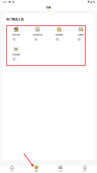 2、點擊底部工具選項,進入功能頁面,可使用充電動畫、充電提示音等熱門精選工具。
