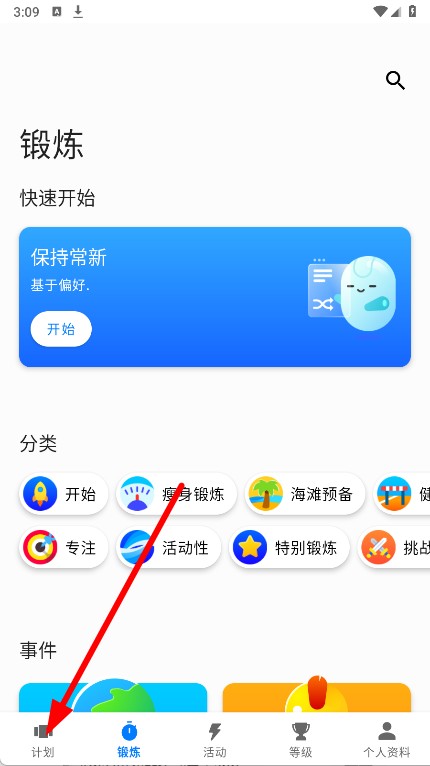 1、打開(kāi)7分鐘鍛煉,點(diǎn)擊底部導(dǎo)航欄的計(jì)劃選項(xiàng),進(jìn)入鍛煉計(jì)劃頁(yè)面。