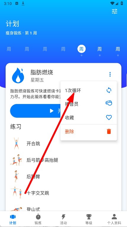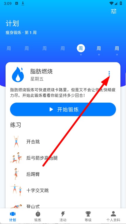 2、找到脂肪燃燒鍛煉項(xiàng)目,點(diǎn)擊其右上角的三點(diǎn)菜單按鈕,彈出操作選項(xiàng)。