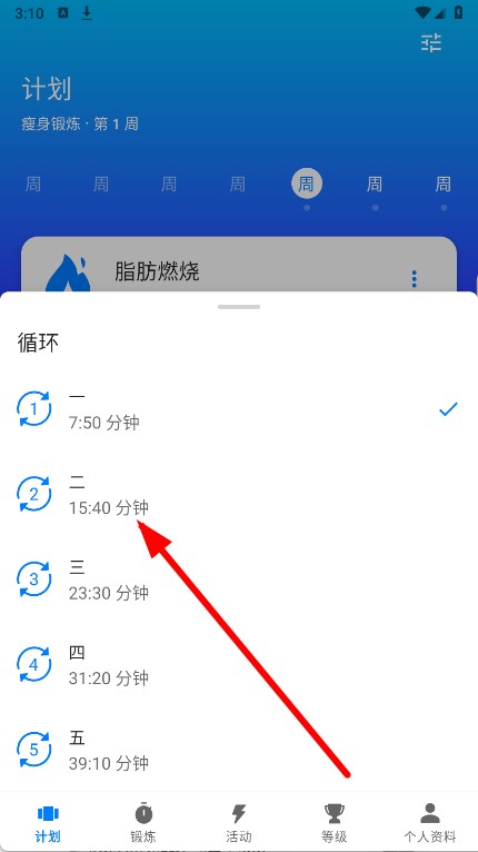 4、根據(jù)需求選擇目標(biāo)循環(huán)次數(shù),完成脂肪燃燒鍛煉循環(huán)次數(shù)的設(shè)置。