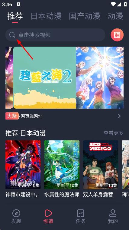 1、在應(yīng)用的頻道頁面,點擊頂部搜索框,進入搜索頁面。