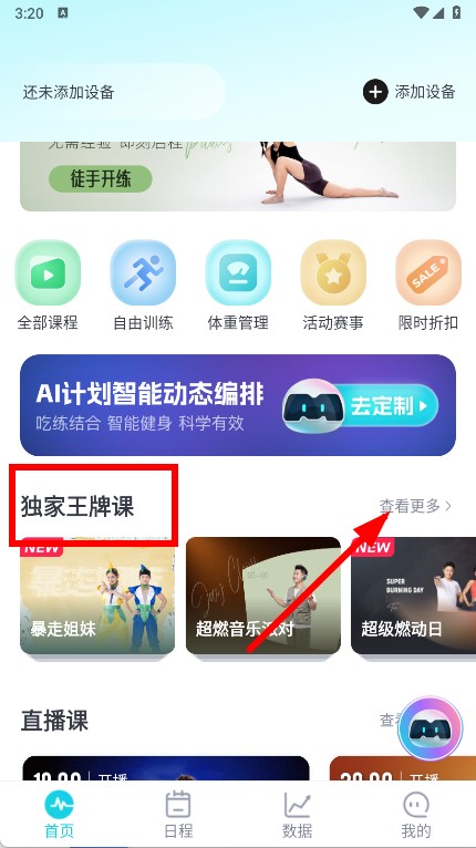 1、打開APP,在首頁(yè)找到獨(dú)家王牌課板塊,點(diǎn)擊其右側(cè)的查看更多按鈕。