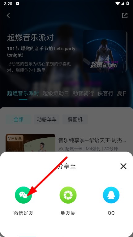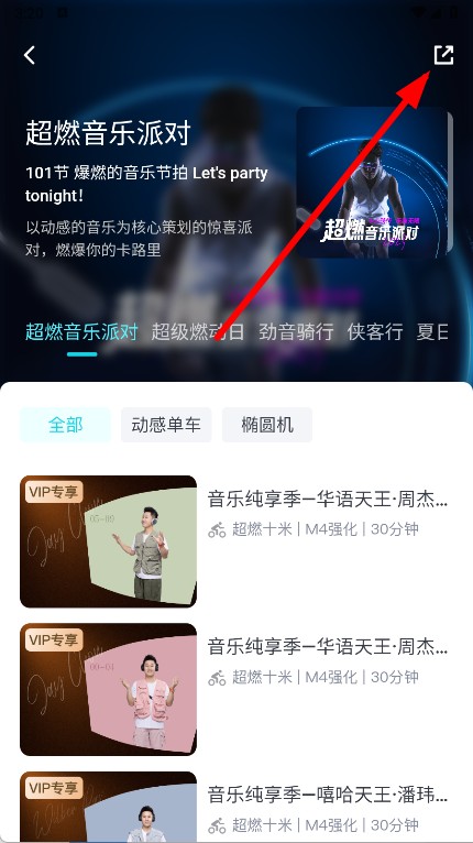 3、在超燃音樂(lè)派對(duì)課程詳情頁(yè)面,點(diǎn)擊右上角的分享圖標(biāo),彈出分享選項(xiàng)。