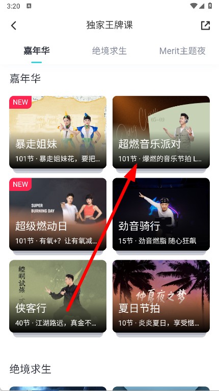 2、在獨(dú)家王牌課列表頁(yè)面,點(diǎn)擊超燃音樂(lè)派對(duì)課程卡片,進(jìn)入該課程的詳情頁(yè)面。