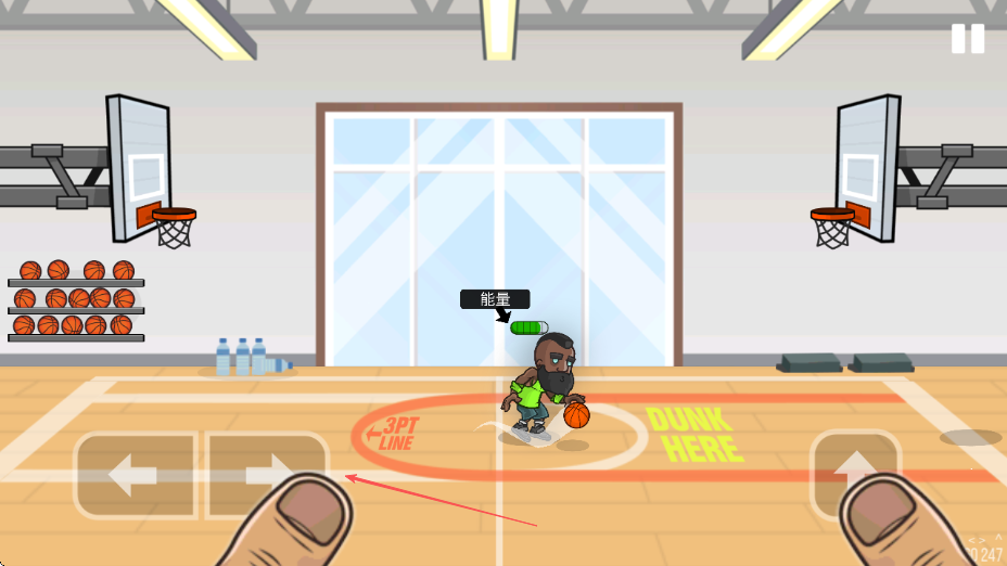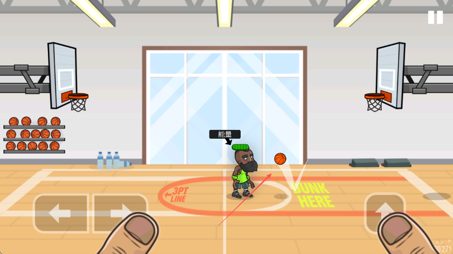 1、通過屏幕下方左右方向鍵控制角色移動(dòng),靠近籃球使其懸浮在身邊獲取籃球。