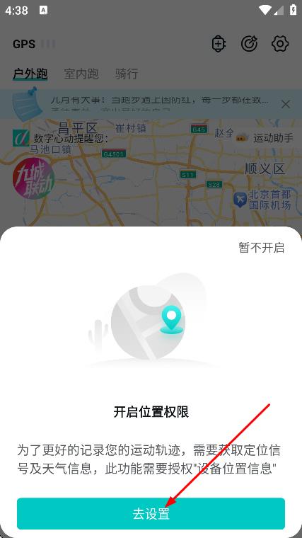2、若彈出開啟位置權(quán)限彈窗,點擊去設置,設置位置權(quán)限。