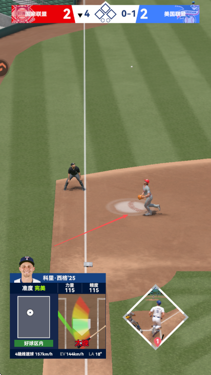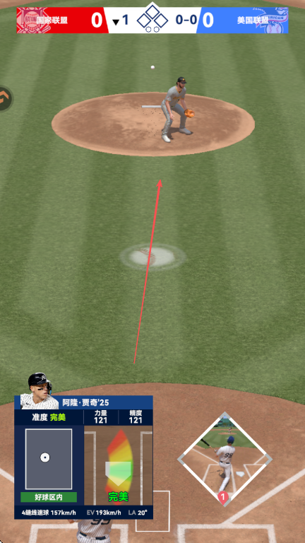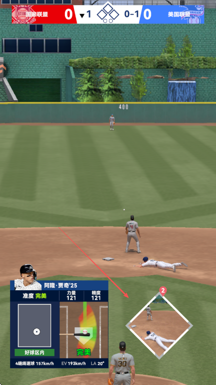 2、作為擊球手時(shí),觀察投手投球,在合適時(shí)機(jī)點(diǎn)擊或滑動(dòng)屏幕進(jìn)行揮棒擊球,注意下方準(zhǔn)度,力量等指標(biāo)。